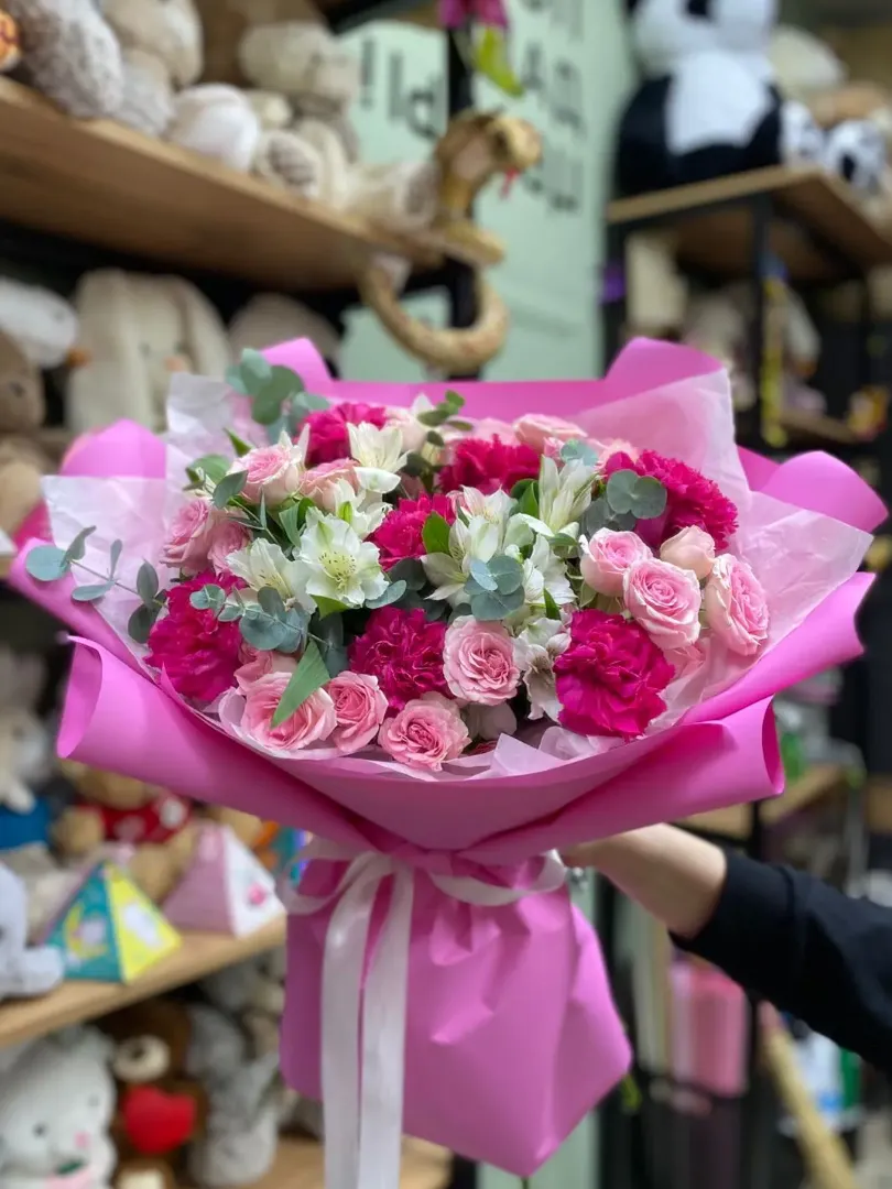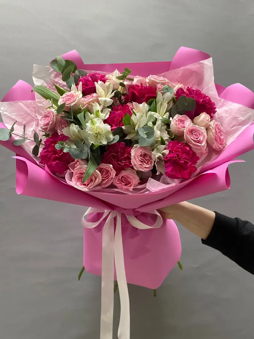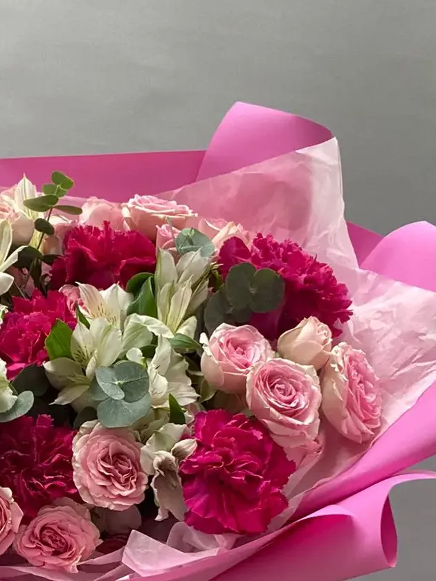«Этот букет - нежное сочетание розовых и белых оттенков, создающее атмосферу тепла и уюта. В его состав входят розовые розы, гвоздики и лилии, дополненные свежими веточками эвкалипта. Композиция идеально подойдёт для выражения любви и признательности.»