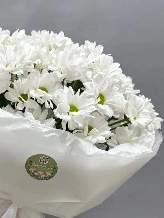 Букет "Снежная нежность" Нежный букет из белых хризантем, символизирующий чистоту и элегантность. Композиция, завернутая в белую упаковку с атласной лентой, излучает свежесть и безмятежность, идеально подходя для любого торжества.
