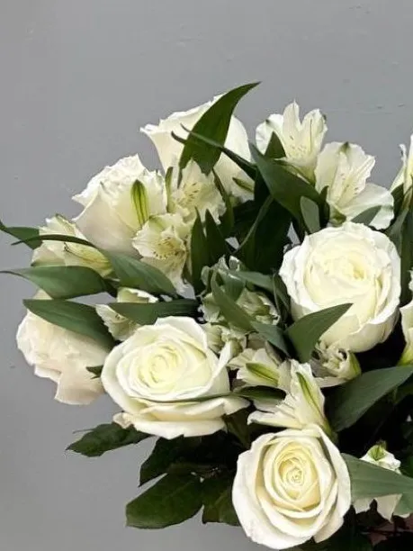 Этот букет - воплощение элегантности и нежности, созданный из свежих белых роз и лилий, переплетенных зелеными листьями. Сочетание этих цветов символизирует чистоту, невинность и глубокое уважение, делая букет идеальным для особых моментов. Композиция излучает спокойствие и гармонию, принося в дом атмосферу уюта и красоты.