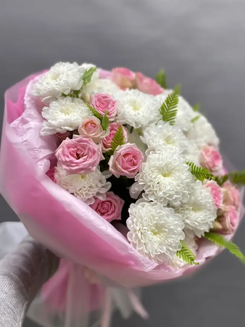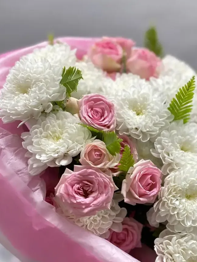 Букет, представленный на изображении, является элегантным и нежным сочетанием цветов, идеально подходящим для различных торжественных случаев. В его состав входят розовые розы и белые хризантемы, которые создают гармоничное сочетание оттенков и текстур. Вот возможное описание букета для каталога цветов: Нежный букет, в котором розовые розы и белые хризантемы создают атмосферу лёгкости и романтики. Упаковка изящного розового цвета добавляет композиции дополнительный шарм, делая ее идеальным выбором для выражения искренних чувств.