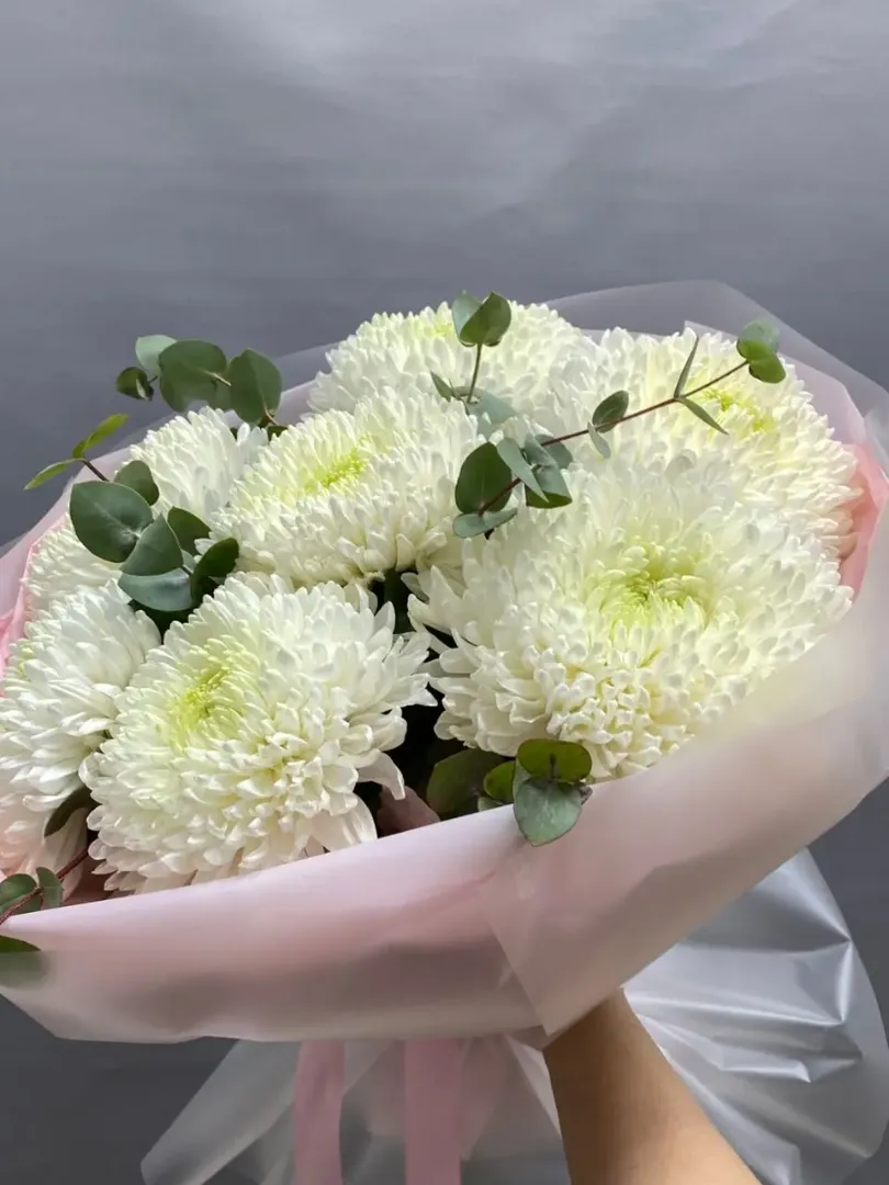 Букет из белых хризантем с добавлением эвкалипта, элегантно упакованный в полупрозрачную белую и розовую бумагу с лентой. Хризантемы символизируют долголетие и радость, а эвкалипт добавляет свежесть и утонченность. Идеальный выбор для тех, кто ценит сдержанную красоту и символическое значение цветов.