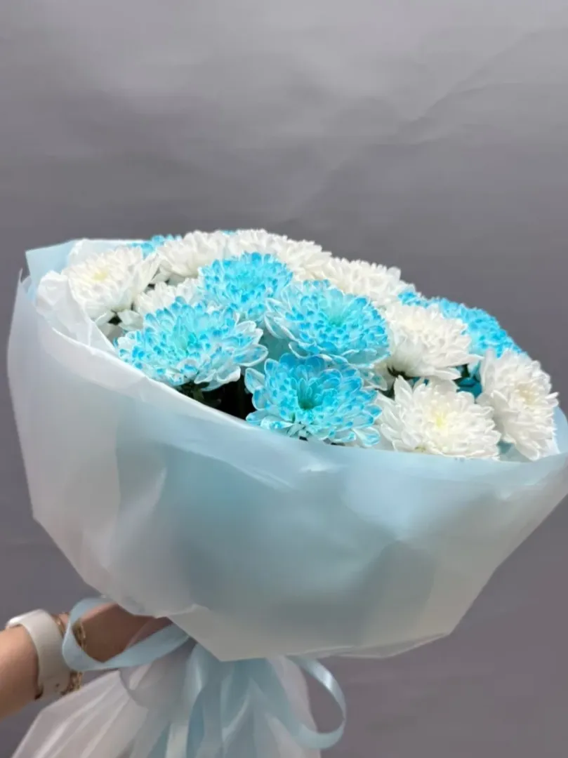 Нежный букет из белых и голубых хризантем, элегантно упакованный в легкую голубую обертку, создает впечатление воздушной легкости и спокойствия. Хризантемы с их тонкими лепестками и мягкими оттенками идеально подходят для выражения чувств без лишних слов. Букет станет прекрасным подарком для близких или украшением для любого торжества.