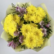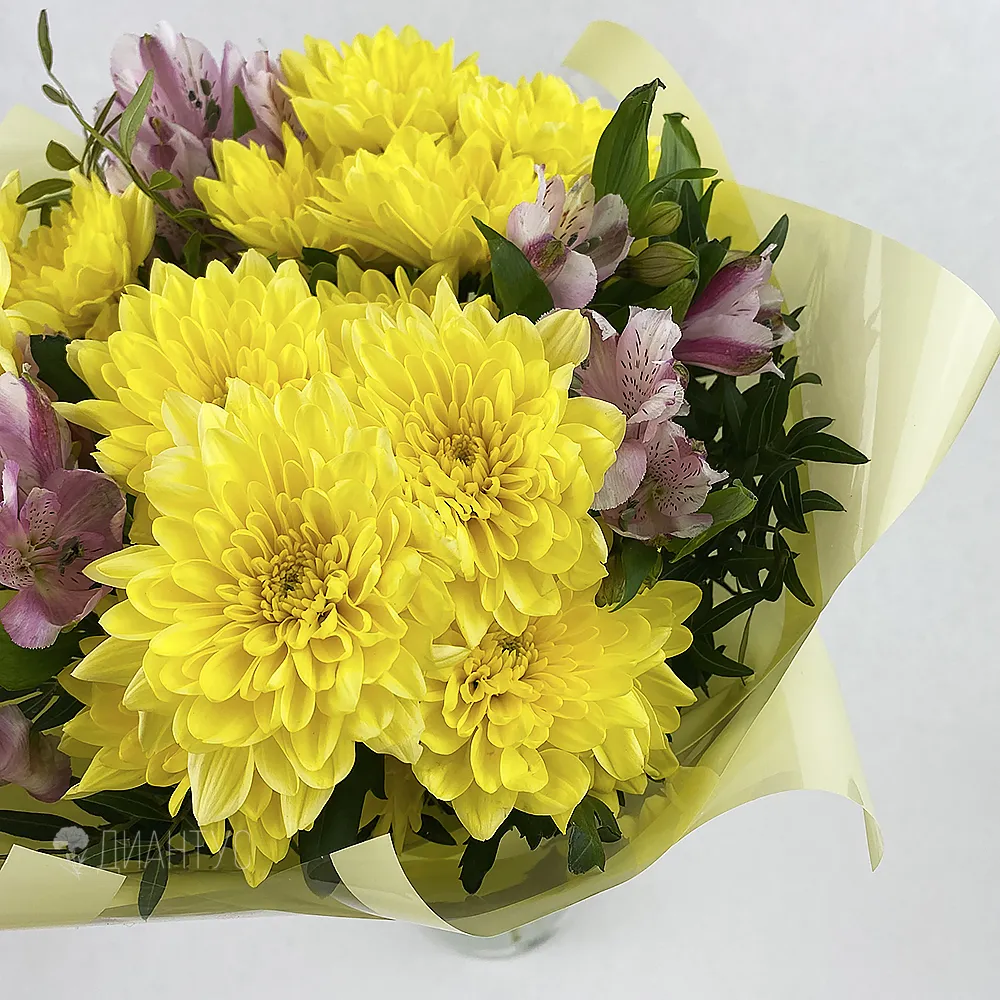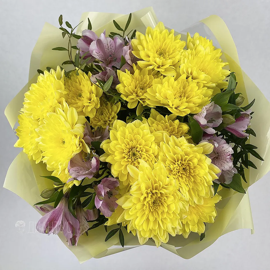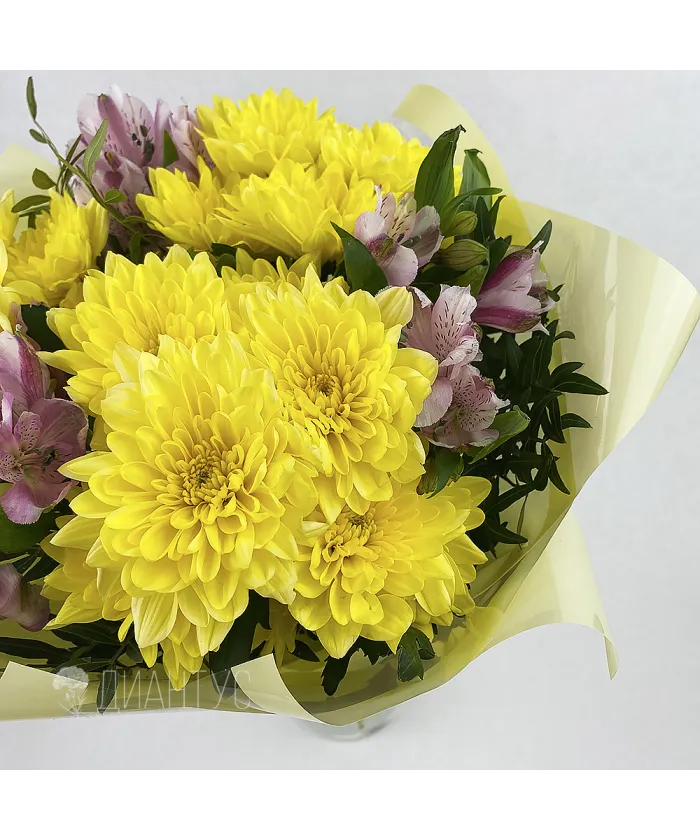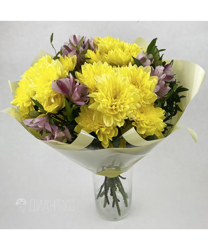 Букет с хризантемами и альстромериями, эти цветы гармонично сочетаются вместе