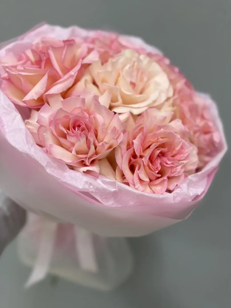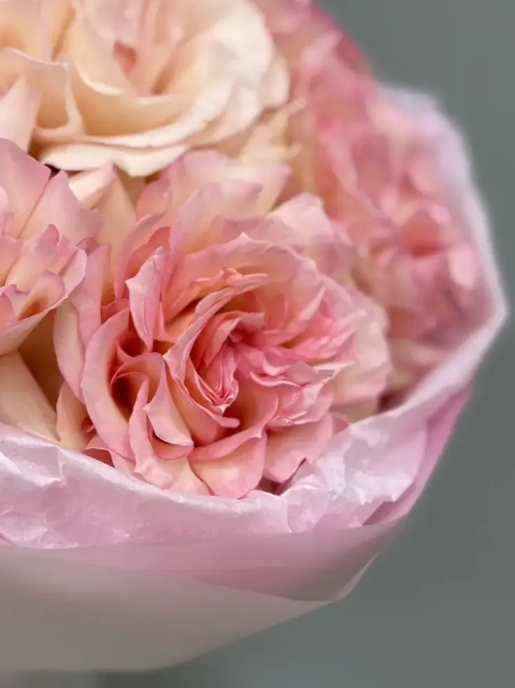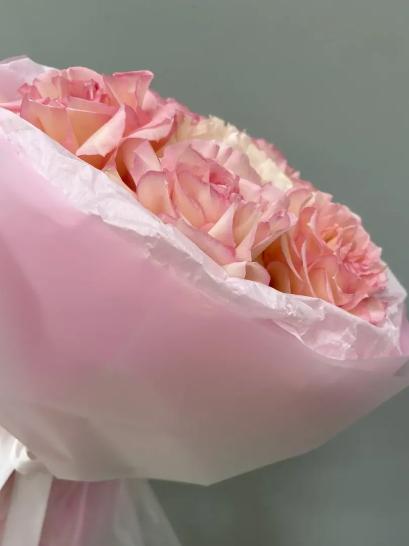Букет из нежно-розовых роз, завёрнутый в тонкую белую и розовую бумагу, создаёт элегантное и романтическое впечатление. Нежные оттенки роз подчёркивают изящность композиции, делая её идеальным выбором для выражения тёплых чувств. Этот букет станет прекрасным подарком для любого романтического повода.