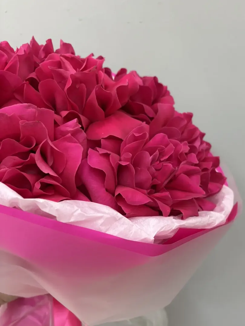Букет, представленный на изображении, - это роскошная композиция из темно-розовых гвоздик, аккуратно завернутая в белую и розовую бумагу. Нежные лепестки цветов и элегантная упаковка создают эффектный и гармоничный образ, идеальный для особого случая или подарка близкому человеку.