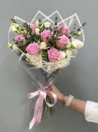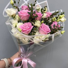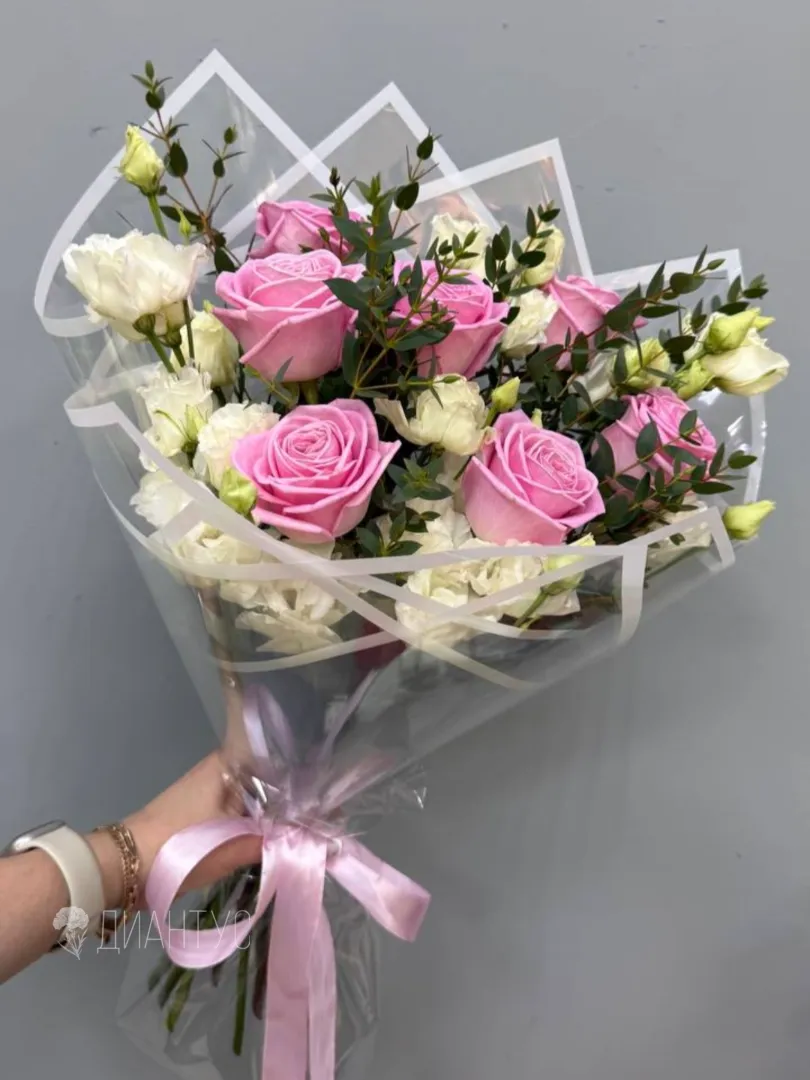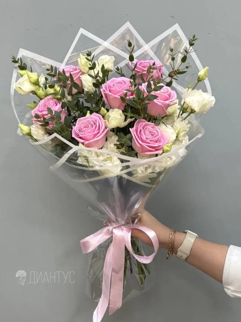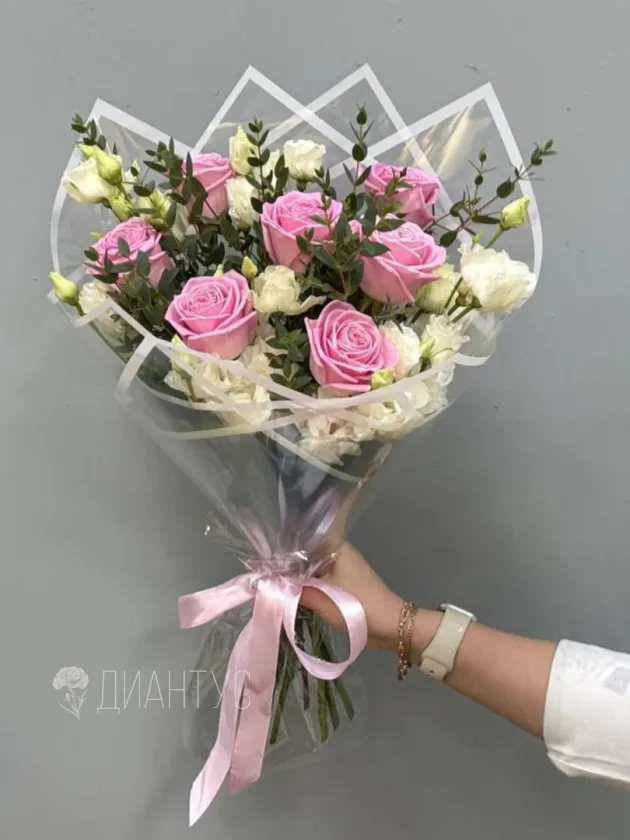 Подарите нежность и элегантность с нашим изысканным букетом! Розовые розы, символ любви и восхищения, изящно дополнены воздушной эустомой, добавляющей букету легкость и романтичность. Зелень эвкалипта придает композиции свежесть и завершенность, подчеркивая красоту каждого цветка. Этот букет станет идеальным подарком для любого случая – дня рождения, годовщины или просто знака внимания. Он выразит самые теплые чувства и оставит незабываемые впечатления. Позвольте себе или своим близким насладиться этой прекрасной композицией.