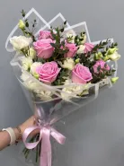 Букет из розовых роз с эустомой